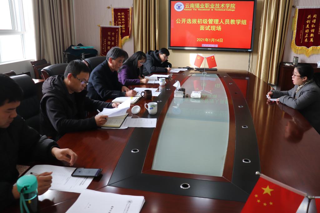 1月14日,云锡职院公开竞聘初级管理人员面试工作拉开帷幕。19名来自学院各部门参加公开竞聘的人员,通过报名资格审查后,在学院教学楼五楼面试现场进行了应聘演讲和综合能力面试。
