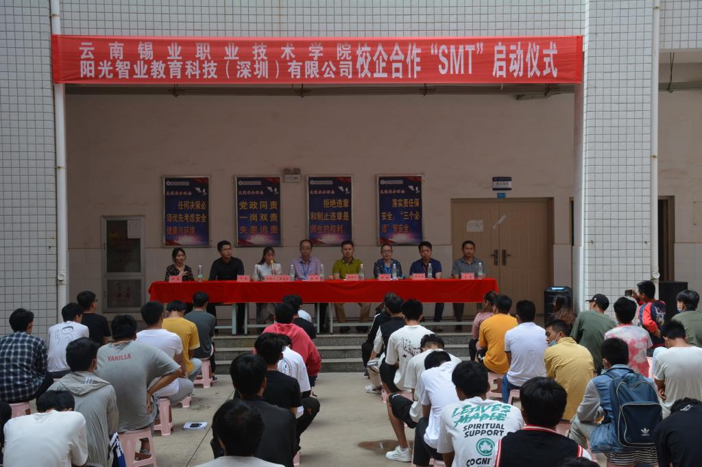 阳光智业教育科技(深圳)有限公司负责人,学院机电工程学院负责人及机电工程学院学生参加了仪式,校企合作共建“SMT班”学生代表、教师师傅代表进行了发言。