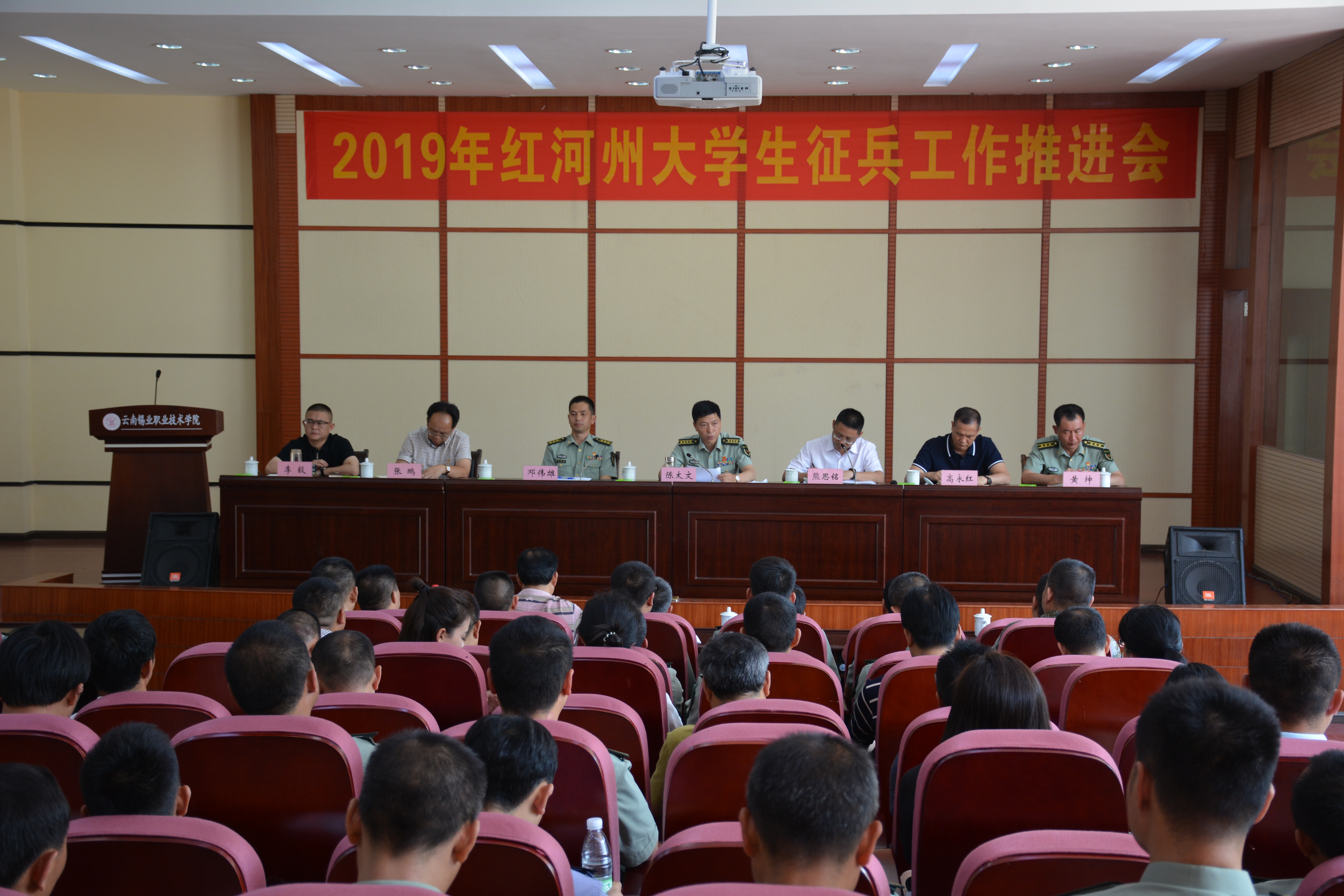 征兵工作推进会在职业学院图书馆一楼报告厅举行。会议全面总结了2018年红河州各单位征兵工作情况,分析了存在的问题,并对2019年征兵工作进行了安排部署。职业学院在2018年征兵工作中成绩突出,征兵计划32人,共完成93人,列全省高校28名,红河州首位,被评为“云南省征兵工作先进单位”。
