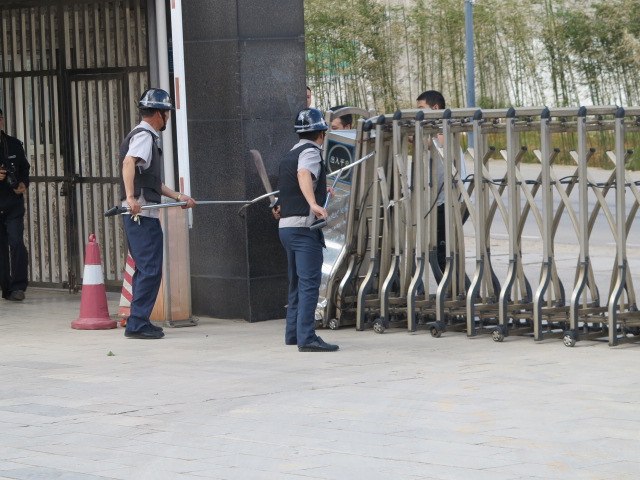 此次演练模拟暴恐分子冲击并闯入学校大门时的场景。当由公安民警和学校保卫人员扮演“不法分子”手持刀具冲击并试图闯入大门时,门卫保安发现后迅速报告学院后勤保卫部值班人员并手持防暴器械与“暴恐分子”对峙,后勤保卫部值班人员在接报后赶往现场的同时向学院领导和110报告(警),公安民警迅速赶到现场,经激烈搏斗,“暴恐分子”被制服并被公安民警带走,师生无一受到“暴恐分子”伤害。整个演练过程,各工作小组各司其职、分工明确,配合默契,演练井然有序。