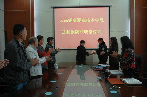 最后,李建波院长代表学院向个旧市公安局建设路派出所邵林伟所长颁发了法制副院长聘书。邵所长在会上作了表态发言并对职业学院多年来对建设路派出所工作的理解、关心与支持表示衷心的感谢。
