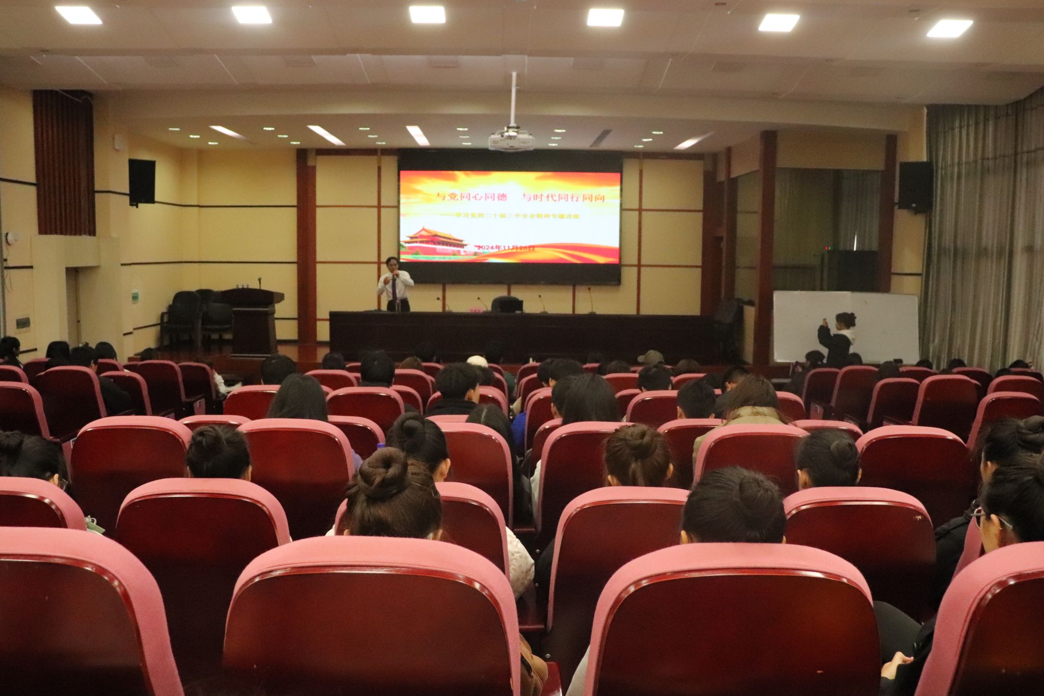 为深入学习贯彻党的二十届三中全会精神,引导学生更好地把握全会核心要义,增强与党同心同德、与时代同行同向的责任感与使命感。11月26日上午,学院思政课特聘教师何跃林在图书馆报告厅为120余名青年学子代表宣讲党的二十届三中全会精神。