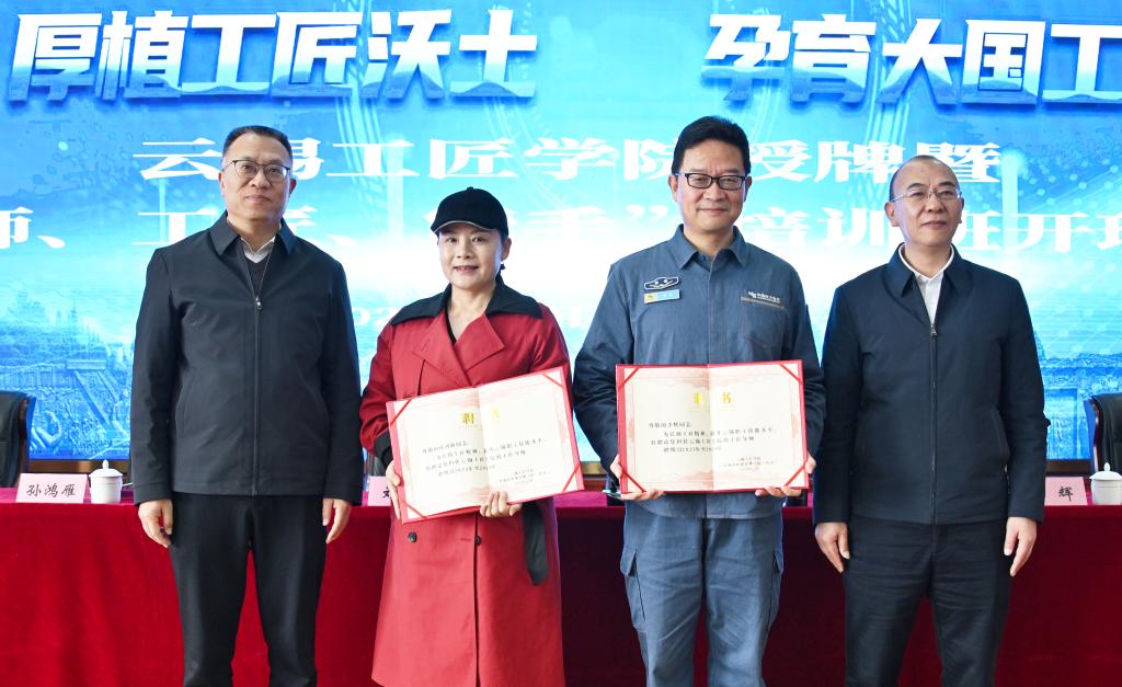 主席台就坐领导为BEAT365英国官网及实训基地授牌,为李辉及首届全国轻工大国工匠、昆明理工大学孙鸿雁教授颁发特聘工匠导师证书。