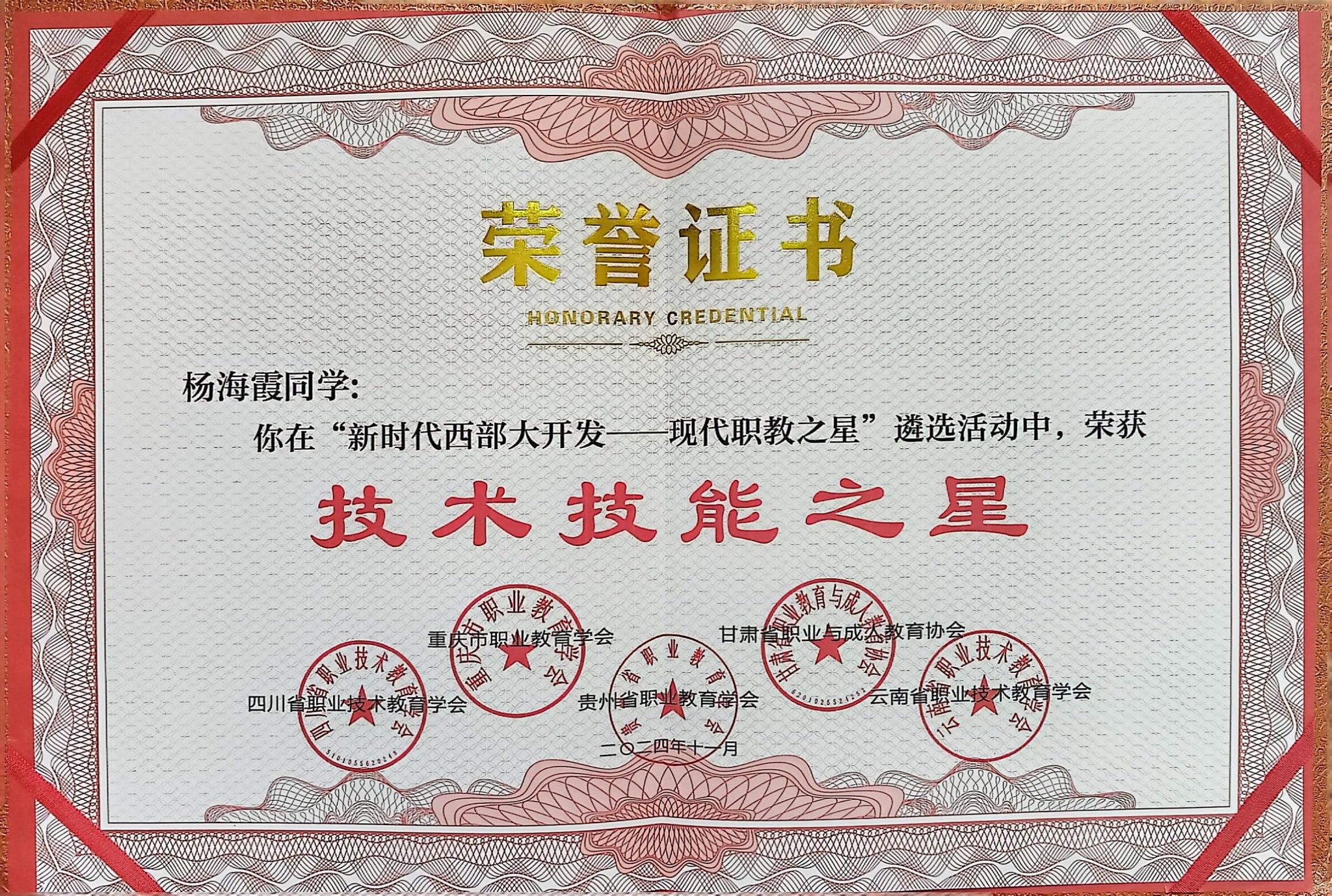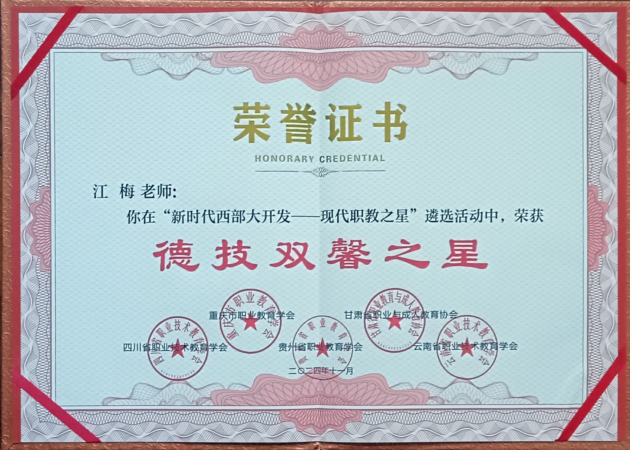 11月7日,由渝、甘、川、贵、云五省市职业技术教育学会联合举办的“新时代西部大开发——现代职教之星”遴选结果公布,学院教师江梅被遴选为“德技双馨之星”,学院青年学子黄辉、杨海霞被遴选为“技术技能之星”。