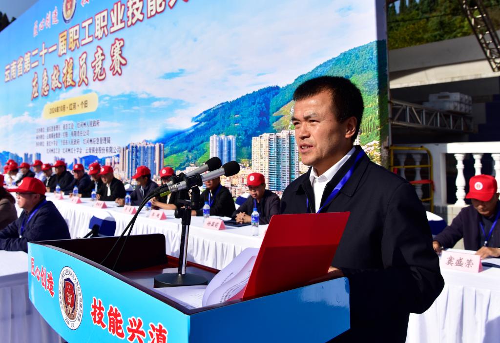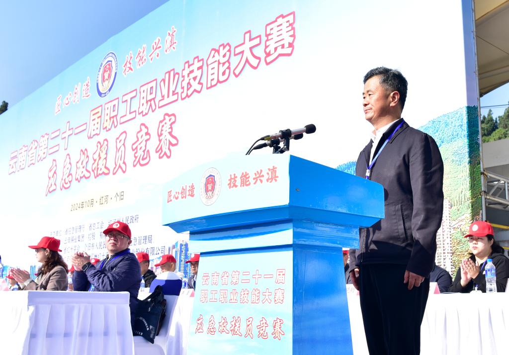 红河州常务副州长李国民致辞,表示红河州将努力推动形成与经济社会发展水平相符合、与人民群众安全需求相匹配的应急救援能力,为全省经济社会高质量发展提供坚实的安全保障。