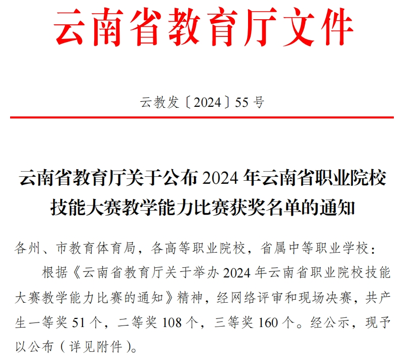 近日,云南省教育厅公布了2024年云南省职业院校技能大赛教学能力比赛获奖名单,学院喜获专业课程一组三等奖1项、专业课程二组三等奖1项。