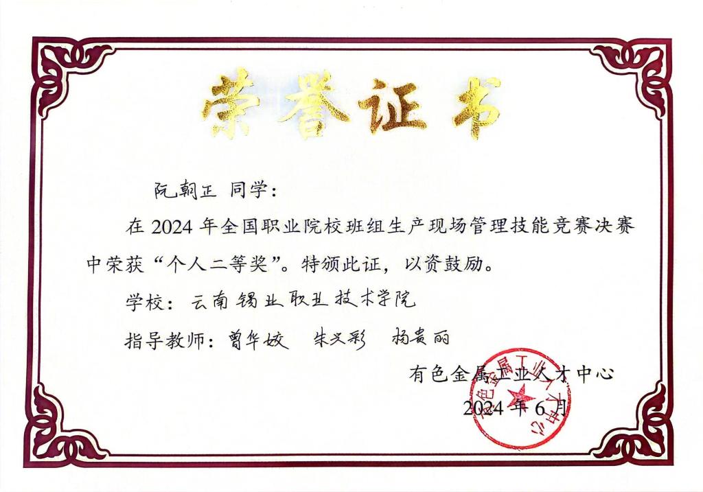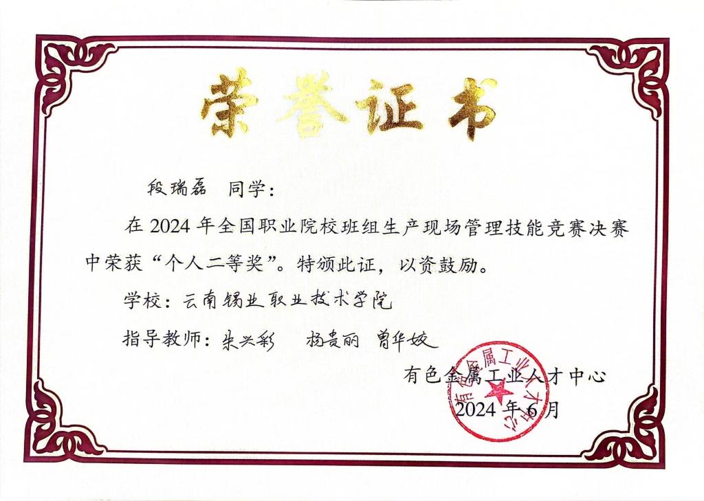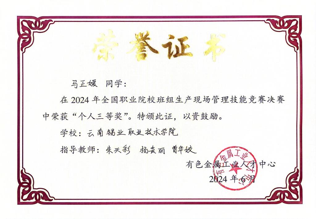 近日,学院在有色金属工业人才中心主办的“2024年全国职业院校班组生产现场管理技能竞赛决赛”中荣获团体三等奖,学生个人荣获二等奖3项、三等奖2项。