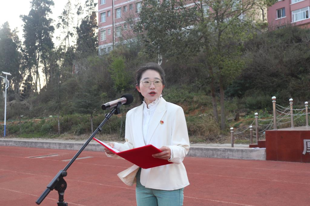 思政课教师代表高慧玲深情讲述了“党史上的今天”并谈到:青年是整个社会力量中最积极、最有生气的力量。在强国建设、民族复兴的奋斗路上,生逢盛世的青年学子不能做置身事外的旁观者,要努力将那一抹中国红化作最坚定的信仰,迎着新时代的号角砥砺前行!