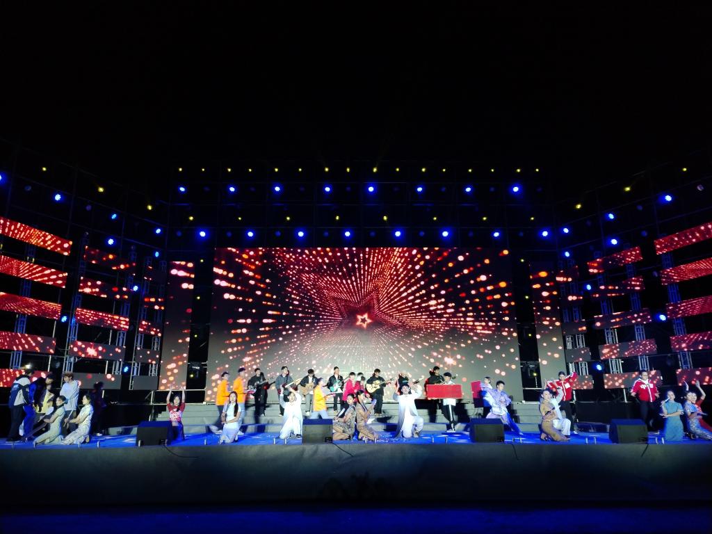 晚会在学院集音社和个旧市乾韵艺术培训学校师生超燃歌曲以及全场师生的欢呼声中正式拉开序幕,旋律激情澎湃,欢呼声回荡校园,瞬间点燃全场。