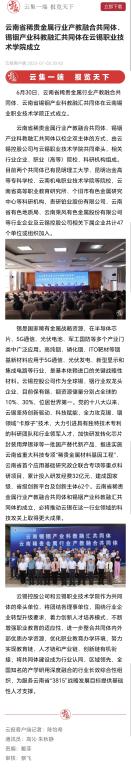 【媒体关注】云报客户端:云南省稀贵金属行业产教融合共同体、锡铟产业科教融汇共同体在云锡职业技术学院成立