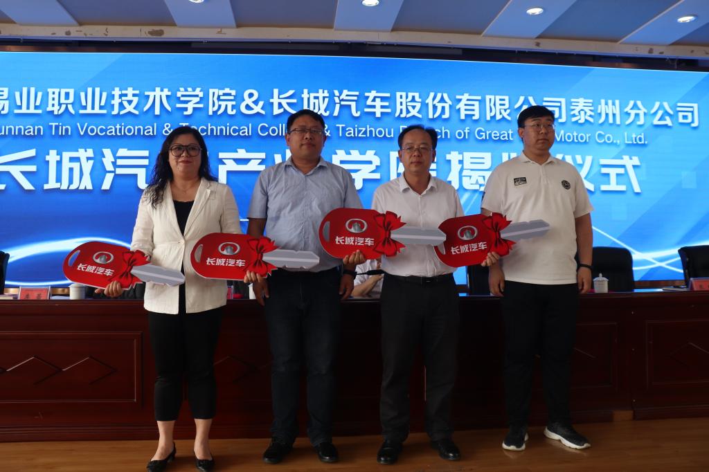 5月30日下午,云锡职业技术学院举行长城汽车产业学院揭牌仪式。控股公司党委副书记、工会主席姚家立,控股公司党委常委、副总经理宋兴诚,长城汽车股份有限公司泰州分公司人事总监赵海峰及职业学院领导班子成员出席仪式。