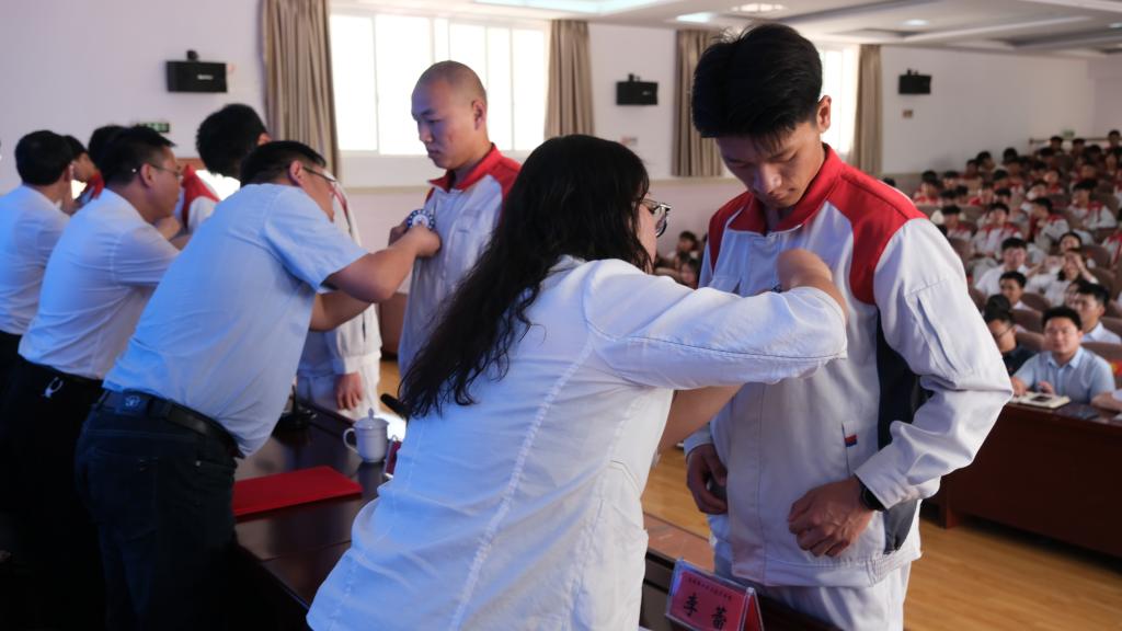 校企双方领导为学生代表佩戴“长城汽车产业学院”徽章,共同为BEAT365英国官网“长城汽车学院”揭牌。