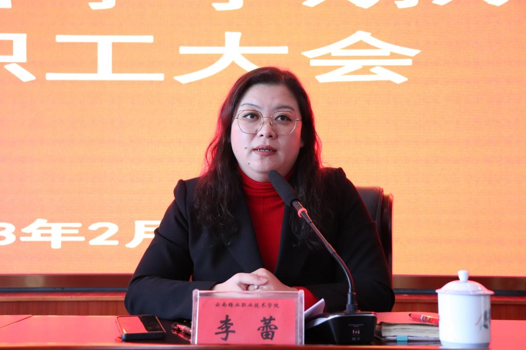 李蕾强调,2023年,学院将在习近平新时代中国特色社会主义思想的指导下,全面贯彻落实党的二十大精神,将学院改革发展各项工作融入国家及云南省教育事业发展大局中,融入到控股公司改革发展大局中,积极应对挑战,主动抢抓机遇,以更高的站位、更大的力度,凝心聚力、奋勇攻坚,全面完成2023年办学经营目标。