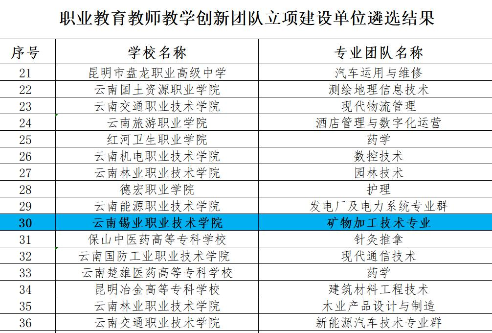 近日,云南省教育厅发布了《关于云南省第一批职业教育教师教学创新团队立项建设单位遴选结果的公示》,学院矿物加工技术专业教学团队入选省级教师教学创新团队。