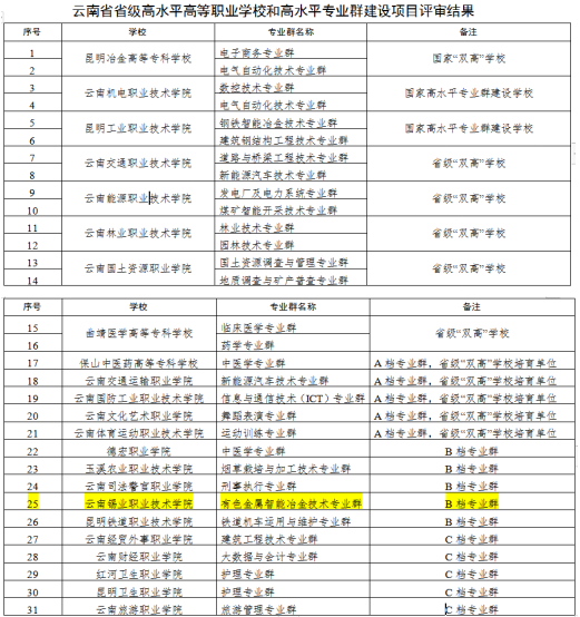 根据《云南省教育厅云南省财政厅关于实施云南省高水平高等职业学校和高水平专业群建设计划的通知》(云教发〔2021〕62号)《云南省教育厅 云南省财政厅关于开展云南省高水平高等职业学校和高水平专业群建设计划项目申报的通知》要求,经学校申报、资格审核、专家评审,云南省教育厅官网于2021年12月23日对拟立项建设的省级高水平高职学校和高水平专业群予以公示。我校有色金属智能冶金专业群成功入选省级高水平专业群建设项目公示名单。