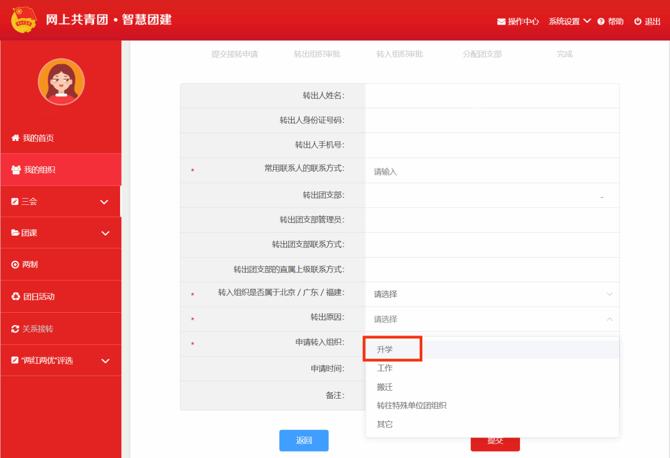 新生团员登录系统进入个人中心,点击左侧“关系接转”菜单。填写接转原因(升学)、转入组织名称等相关信息,检查无误后点击提交,等待审批即可。