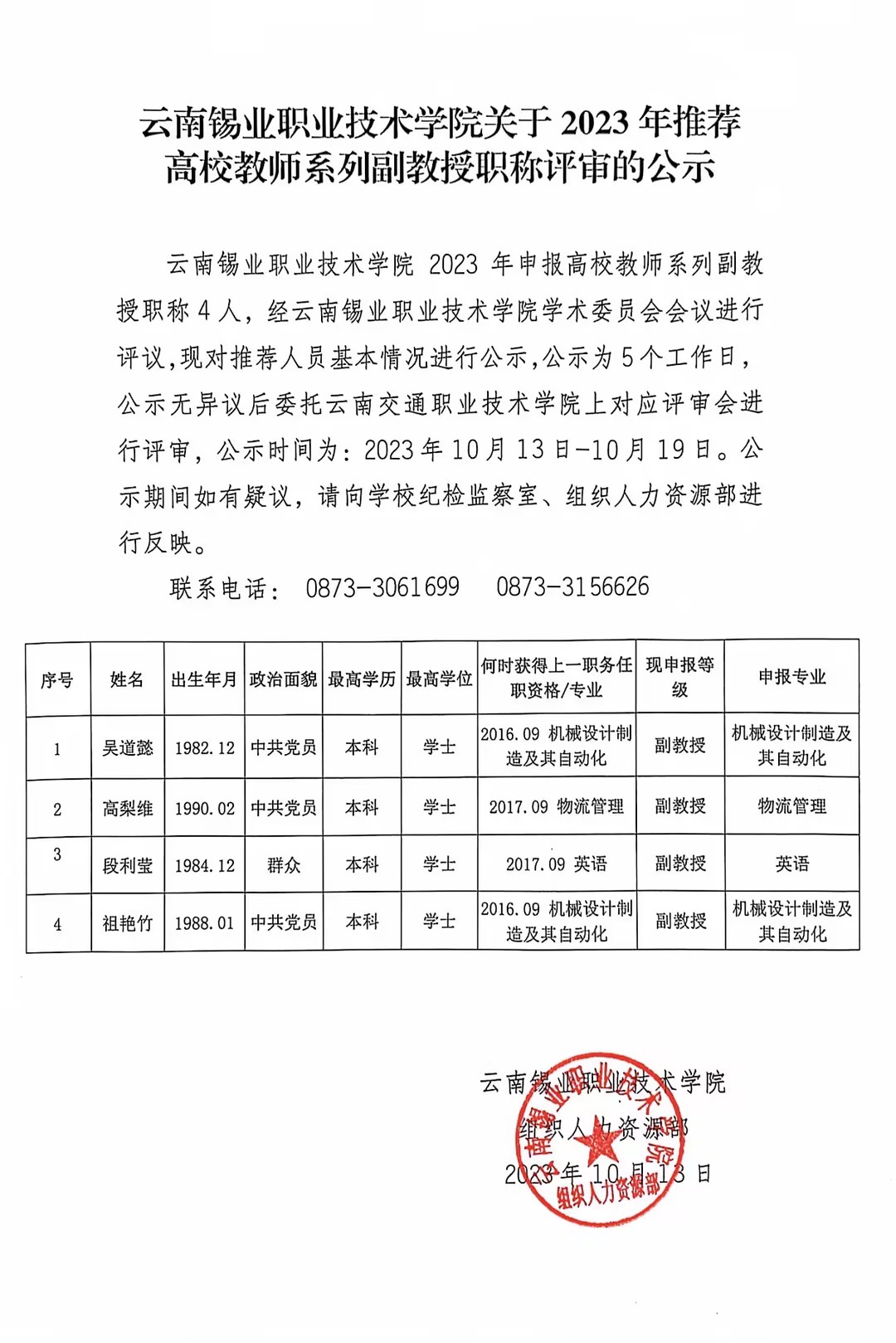 BEAT365英国官网关于2023年推荐高校教师系列副教授职称评审的公示