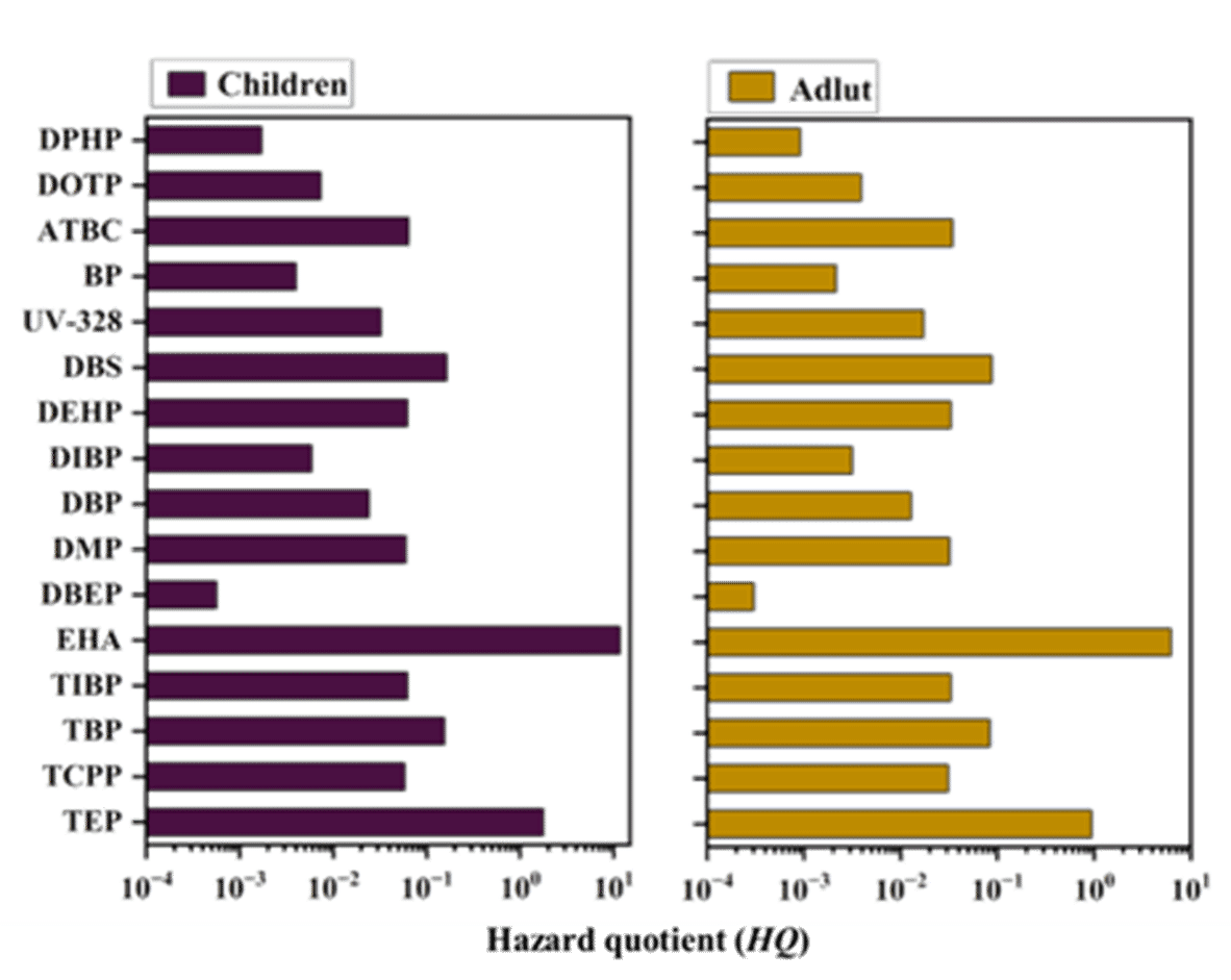 计算了儿童和成人通过饮食摄入添加剂的估计每日摄入量(EDI)和风险商(HQ),发现EHA和TEP的HQ值超过1,表明其暴露水平超过了可接受阈值。此外,考虑到新鲜果蔬包装中多种添加剂的共存,还计算了潜在的“鸡尾酒效应”风险,结果显示儿童和成人的风险指数(HI)分别为14.2和7.6,超过了个别化合物的“安全”阈值,表明当前暴露水平可能引发更高的暴露风险。