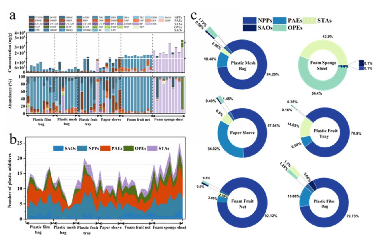 图1. 新鲜果蔬包装中添加剂的含量水平和赋存特征