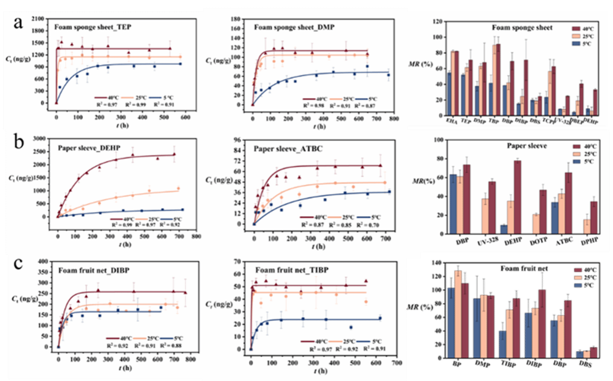 实验室模拟了不同温度(5 ℃、25 ℃和40 ℃)下添加剂从鲜果蔬包装中释放的动力学。结果显示,大多数添加剂在最初的100小时内迅速迁移,最终在800小时达到平衡。泡沫水果网中的添加剂表现出最高的迁移比例,其中6种添加剂在25 ℃下的迁移量从1.19×101ng到6.25×102 ng不等。二苯甲酮(BP)在迁移过程中完全释放,其在塑料食品包装中常用作紫外线吸收剂和光稳定剂,被国际癌症研究机构分类为可能对人类致癌物质,其完全迁移引发了对膳食暴露风险增加的担忧。