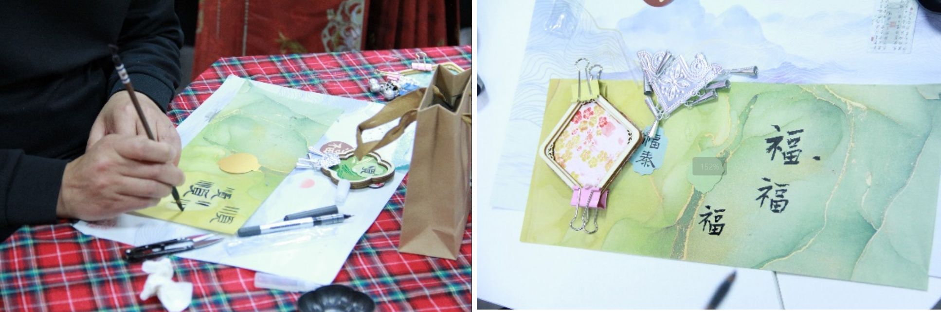 在挑选和书写祝福语环节,大家反复斟酌比对,即使没有修习过书法的老师,也认真临摹练习起来,期望亲自执笔书写真情实感,表达祝福。