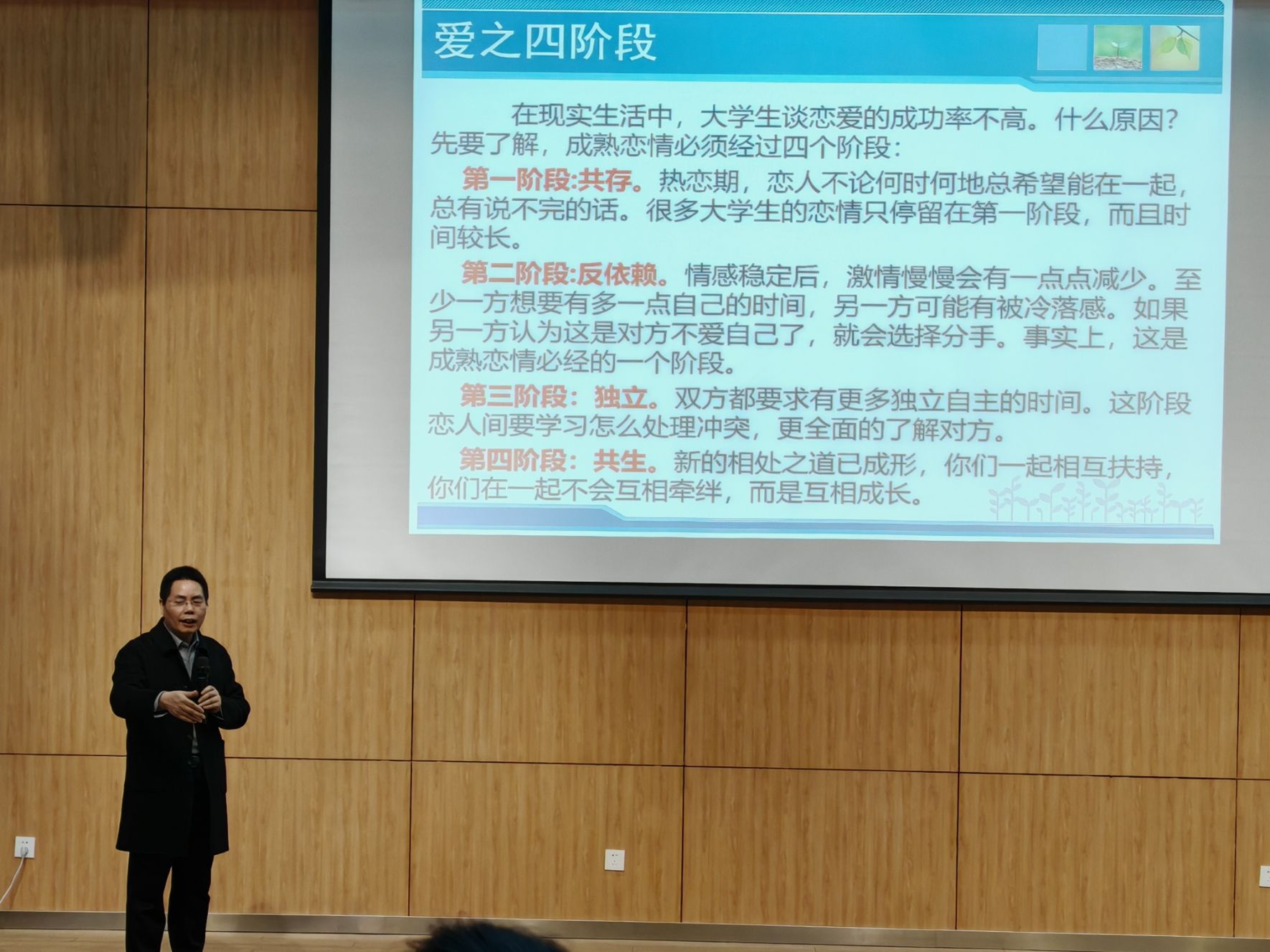 讲座剖析大学生常见心理问题:学业压力需设定“具体、可衡量”目标,专注可控因素;人际关系矛盾可通过“以己待人”的黄金准则化解;情感问题应理解恋爱四阶段(共存、反依赖、独立、共生),接纳冲突与成长;职业迷茫需平衡目标与现实,接纳不确定性。