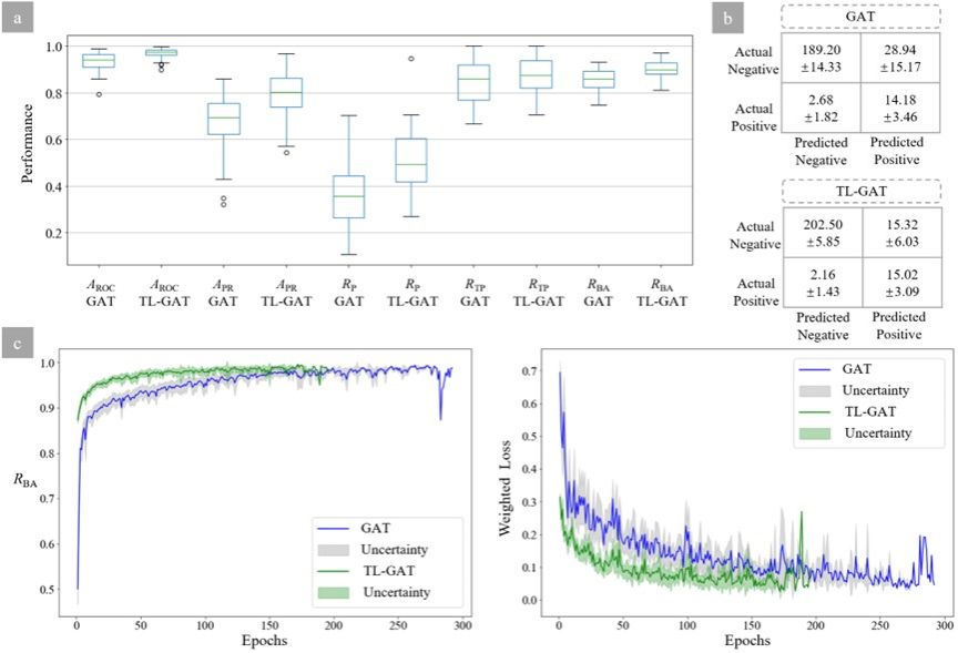 图1. TL-GAT模型与GAT模型性能:(a) 模型受试者工作特征曲线下面积(AROC)、精度-召回率曲线下面积(APR)、精度(RP)、召回率(RTP)和平衡准确率(RBA)值;(b) 模型混淆矩阵;(c) 模型学习曲线。