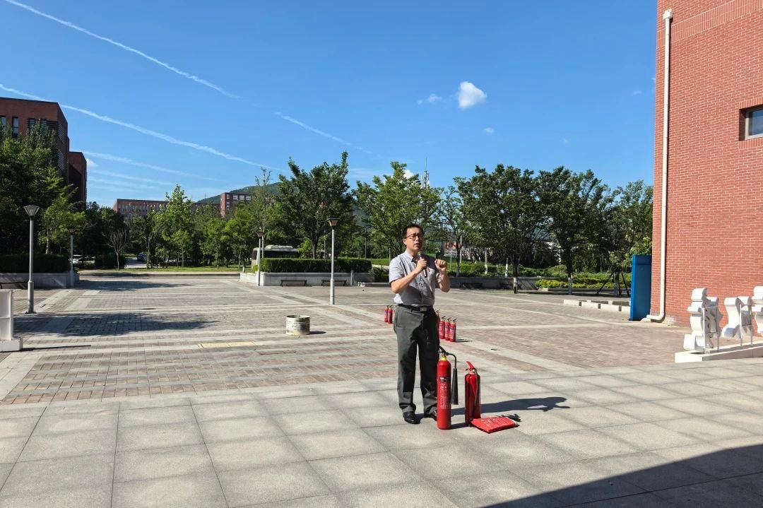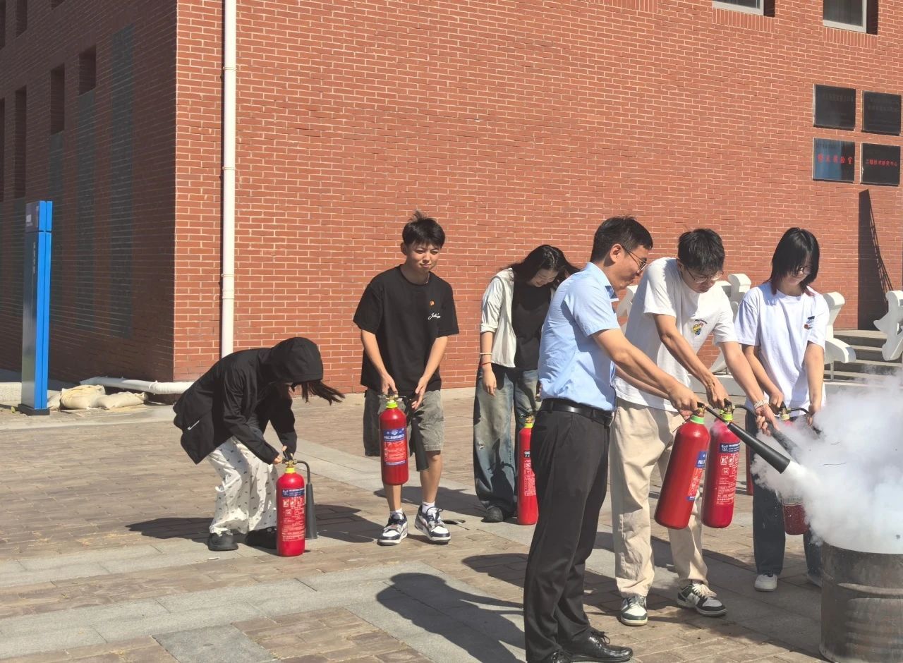 学院楼前李伟重点讲解了“防、救、跑”安全策略,结合场所内紧急避险措施开展了细致讲解,并现场演示灭火器与灭火毯的使用方法,强调灭火器操作规范与安全注意事项。随后师生分组进行灭火器实操演练,在实践中掌握应急处置技能。