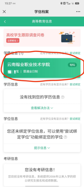 1.关注公众号“学信网”,绑定学信网账号,点击“学信账号”,查看学籍学历信息